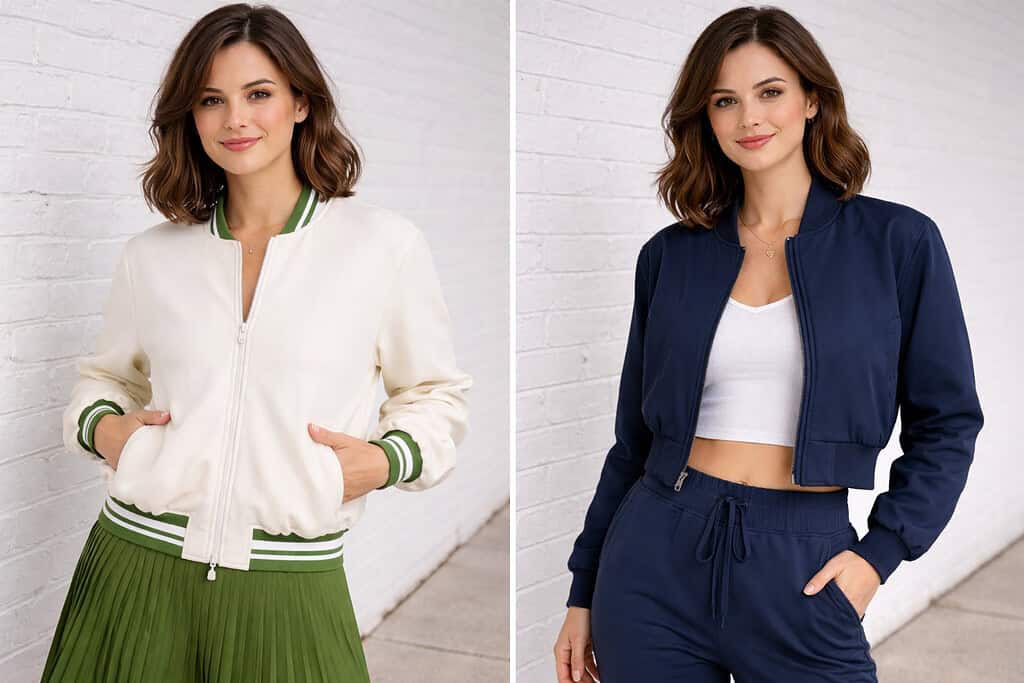 Step out in a stylish bomber jacket that effortlessly elevates your athleisure ensemble.