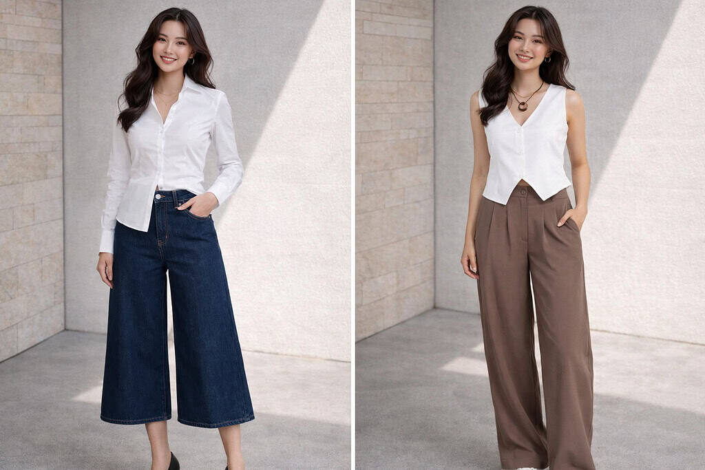 - High-waisted pants: These elongate the legs and create the illusion of height.
