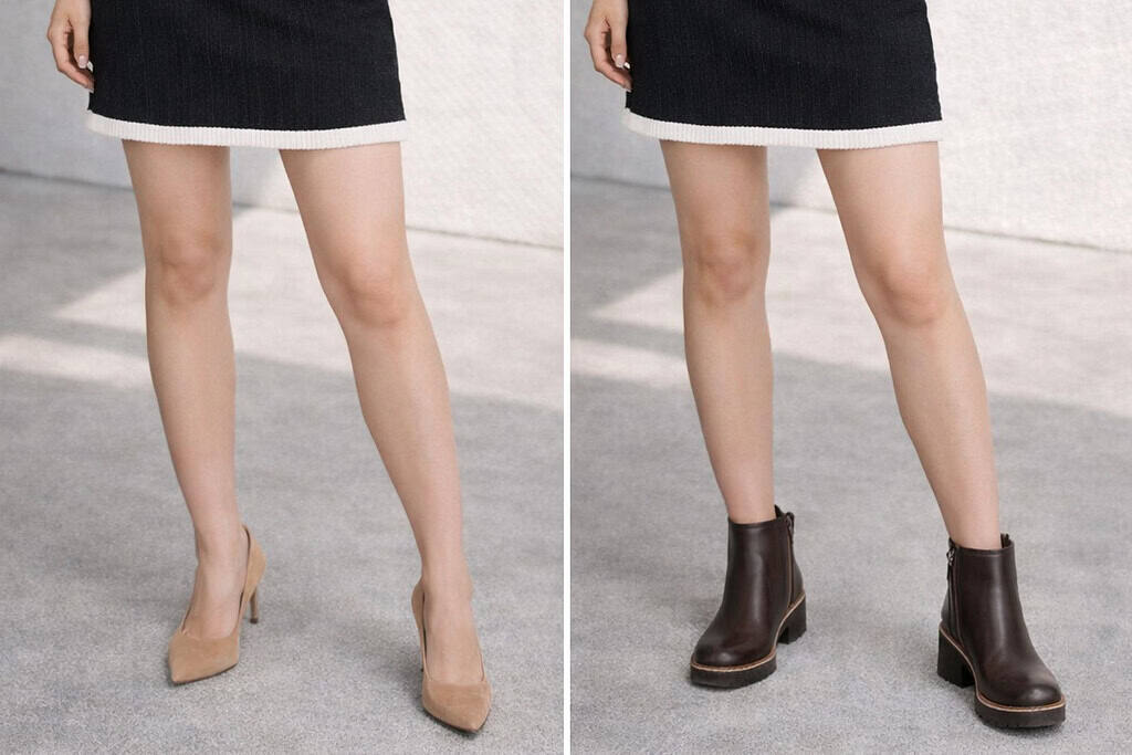 Pointed-toe flats offer a sleek and elongating effect. In colder months, opt for ankle boots with a low or mid-heel that hits at the ankle to avoid cutting off your leg line.