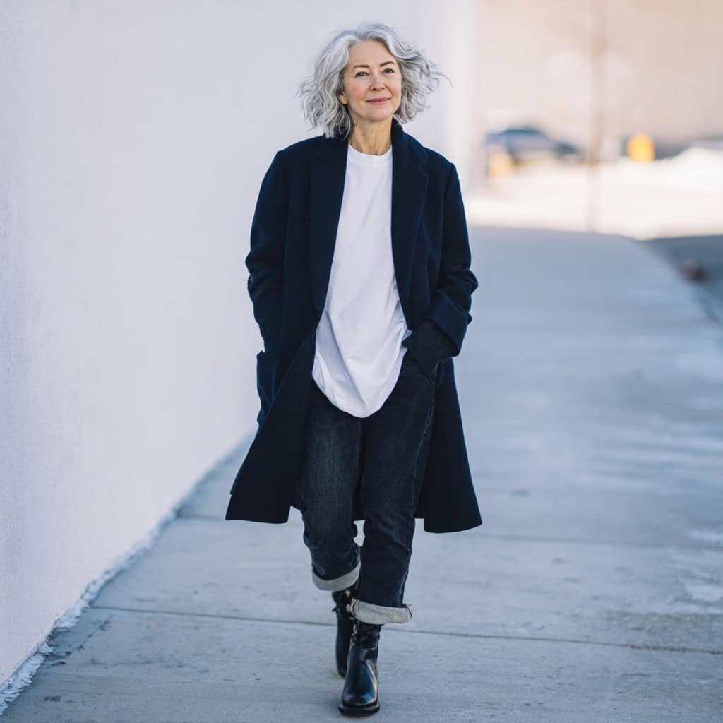 The white tee near your face brightens your skin, while the navy coat keeps the whole look grounded and classic.