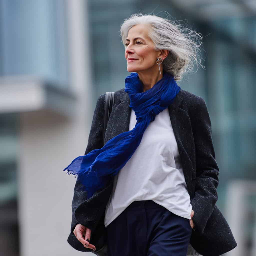 Pick one bag in black, navy, or gray. Add one or two scarves in bold or icy shades that flatter your face, like cobalt or icy pink.