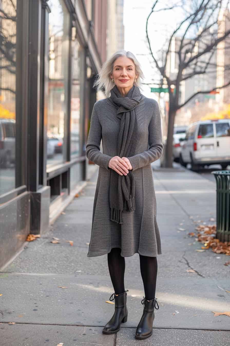 Sweater dresses are great for travel or one-piece dressing. The gray keeps things neutral and clean. Black boots add contrast and support.