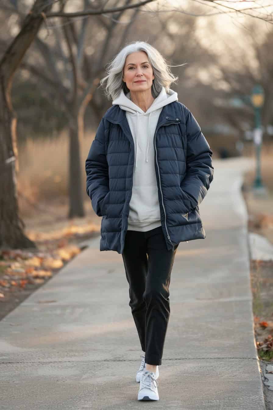 15. Navy puffer jacket, white hoodie, black joggers, and sneakers