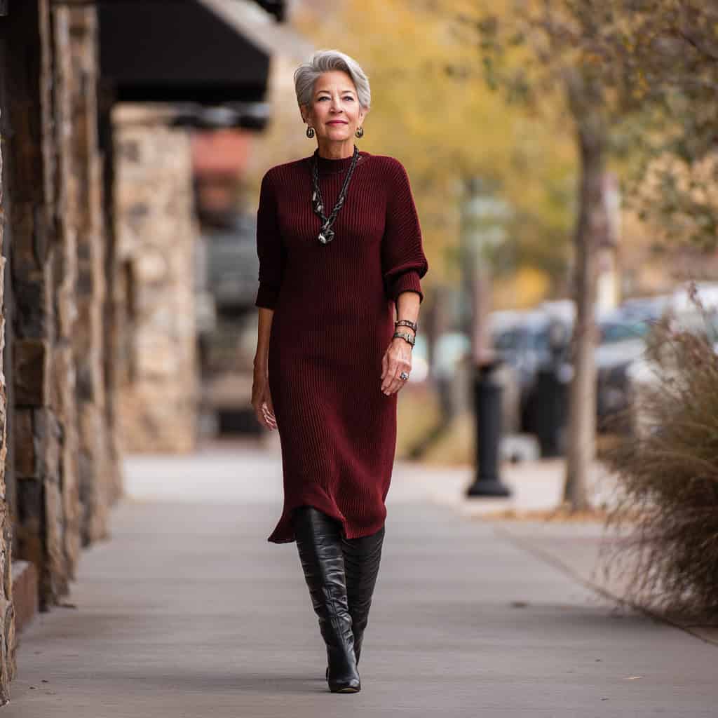 4. Burgundy knit dress + black tall boots + silver earrings