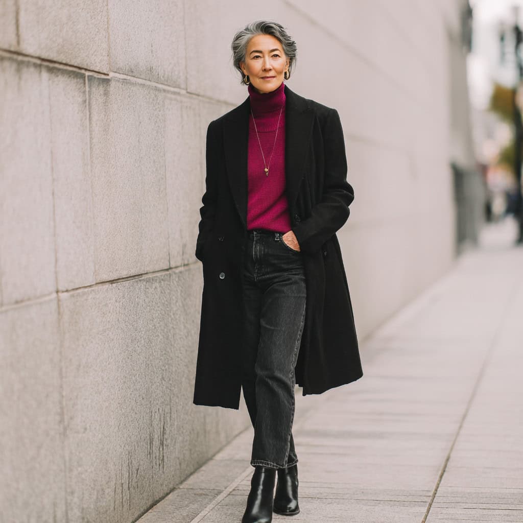 1. Black wool coat + dark jeans + berry turtleneck + ankle boots