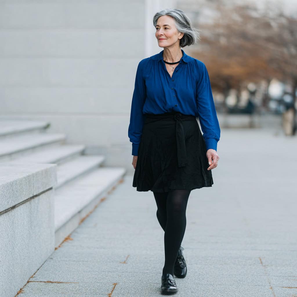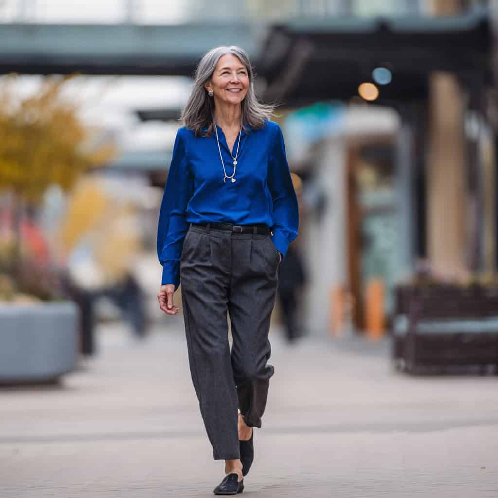 The deep sapphire blue looks stunning on cool-toned skin and pairs beautifully with black. Loafers keep it practical and comfortable for longer wear.