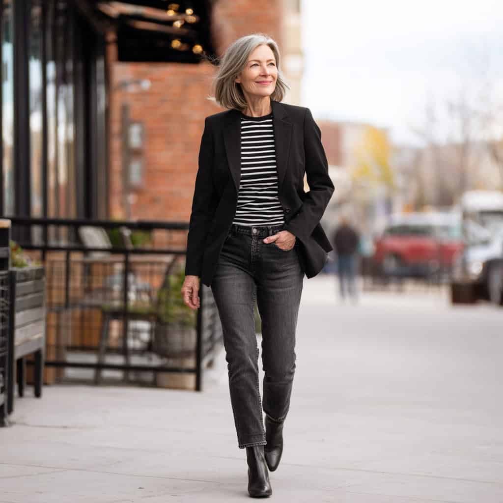 6. Black blazer + striped tee + dark jeans + ankle boots