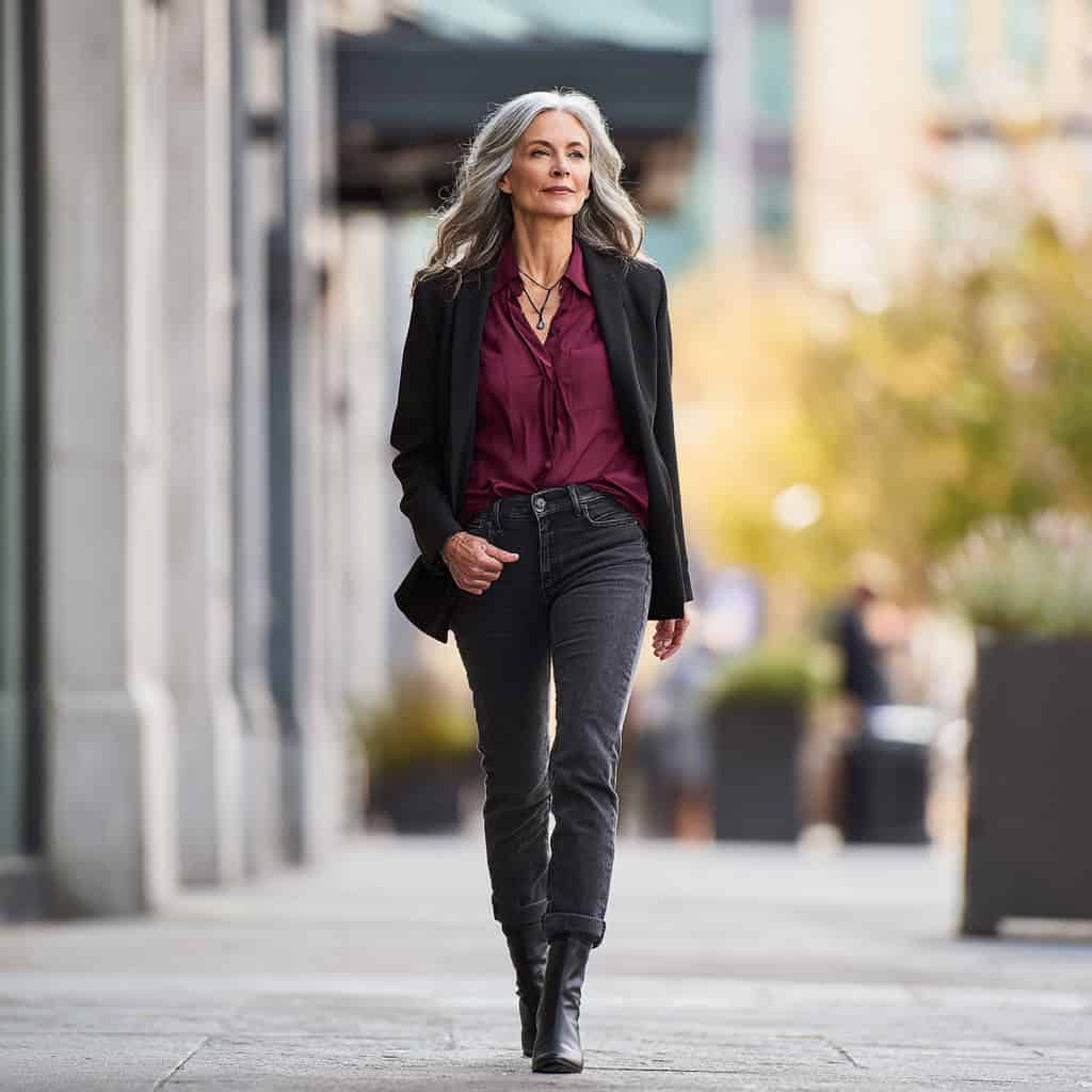 The berry color flatters your skin tone, and the black blazer gives structure. Jeans and ankle boots keep it grounded and wearable.