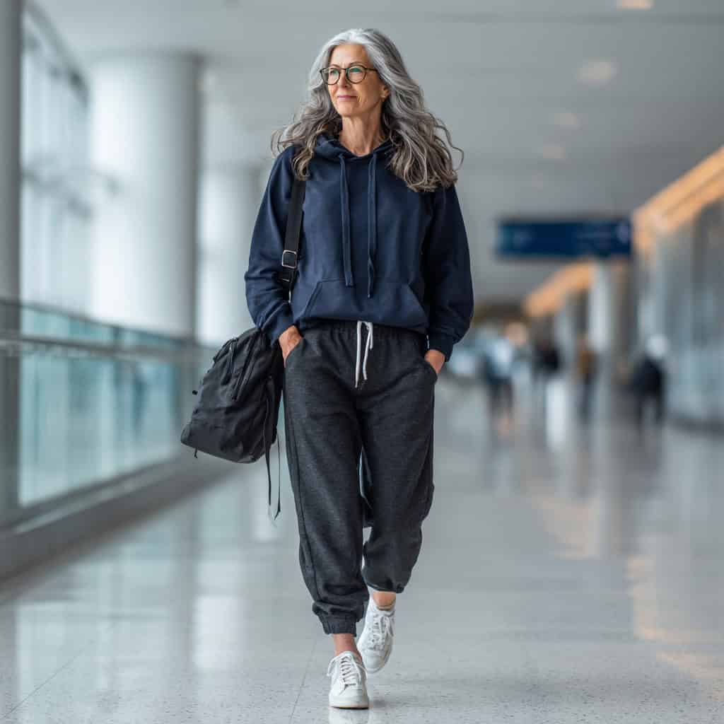 21. Travel day: navy hoodie + black joggers + white sneakers