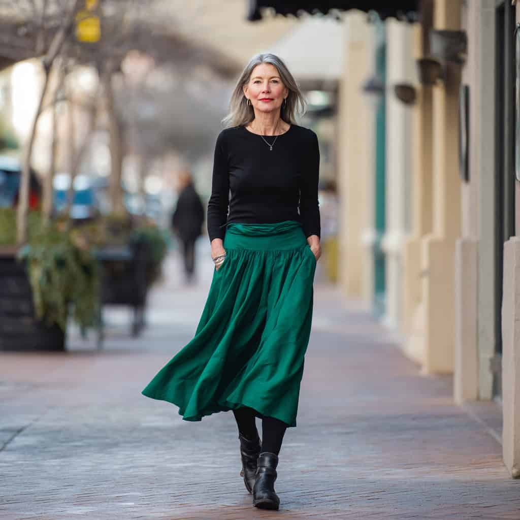 The emerald skirt brings a beautiful jewel tone to your wardrobe, while the black top and boots keep everything balanced.