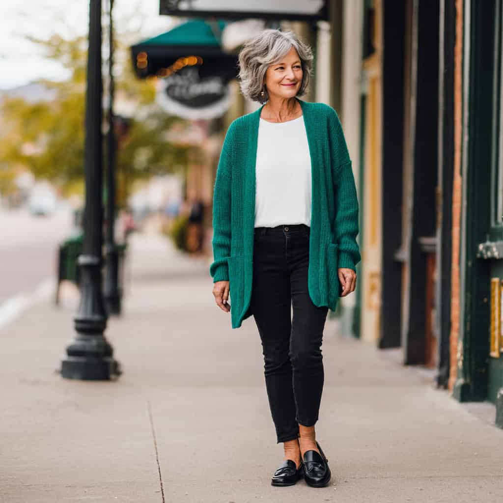 12. Emerald cardigan + white tee + black jeans + loafers