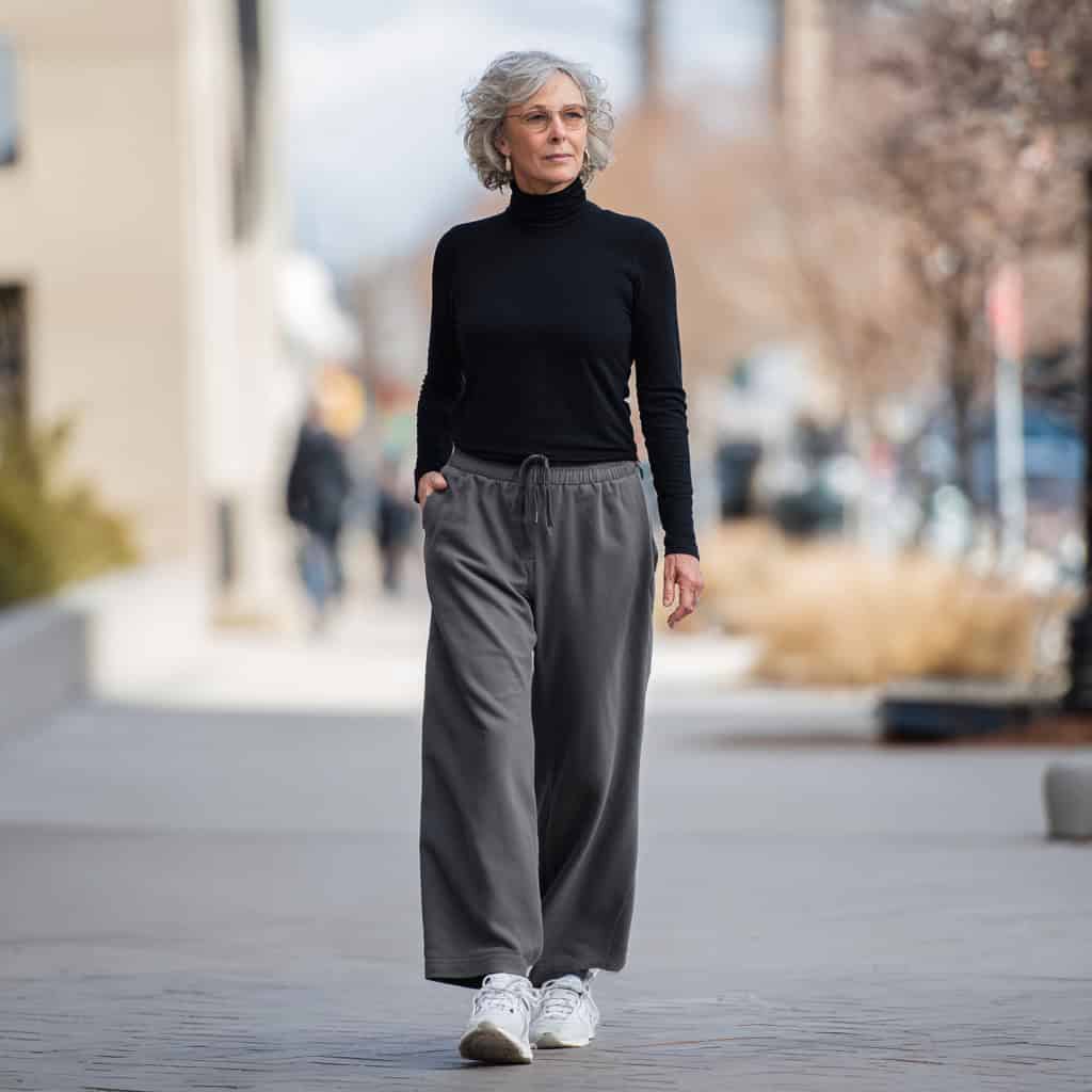 10. Black turtleneck + charcoal wide-leg pants + white sneakers