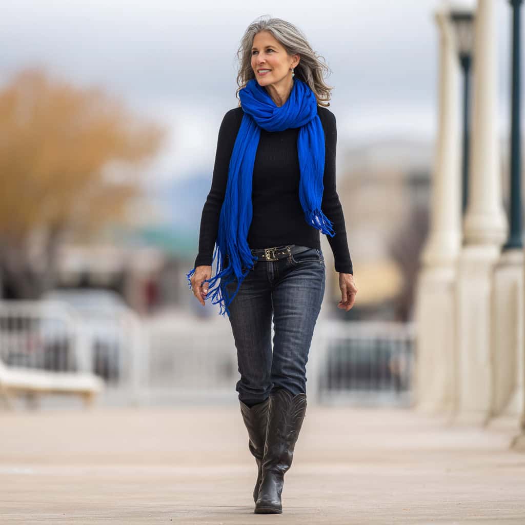 If you ever feel like your outfit needs a boost, add a bright cobalt scarf. It draws attention to your face and makes simple pieces (like jeans and a knit top) look complete and stylish.