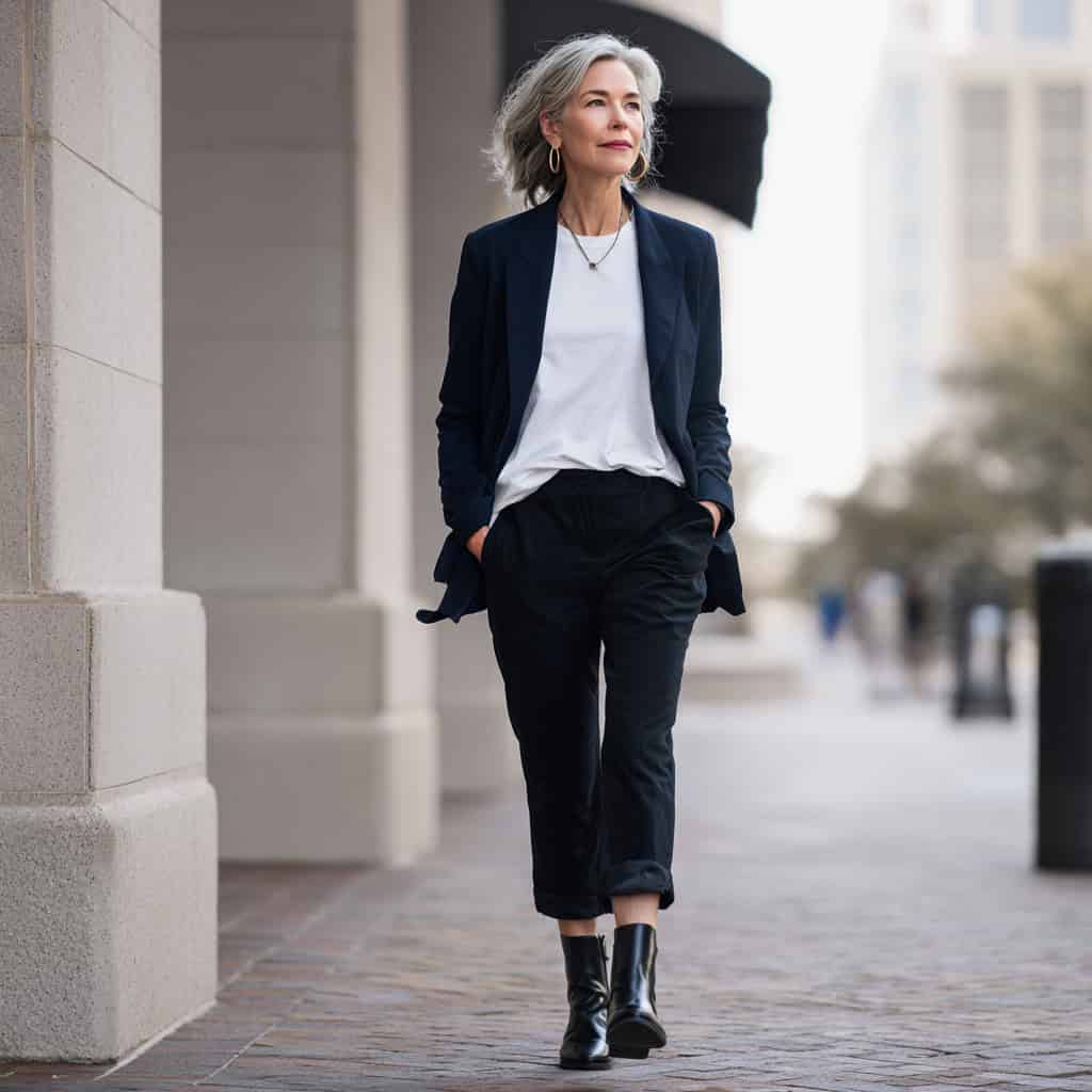 Day 1 | Work or appointments | Navy blazer, white tee, black pants, black loafers. Add silver earrings for polish. |