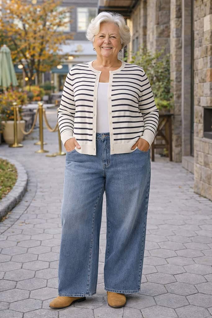 So, look for classic pieces like well-tailored blazers, midi-length dresses, and quality denim paired with sophisticated accessories.
