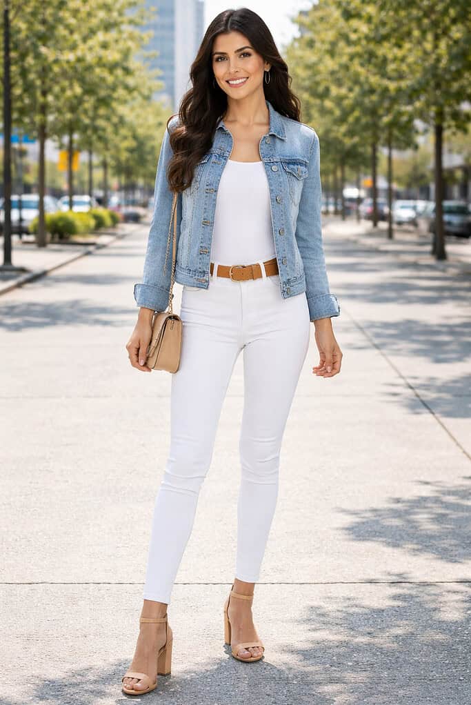 It's all about starting with the essentials like a white blouse, denim jacket, and high-waisted jeans,