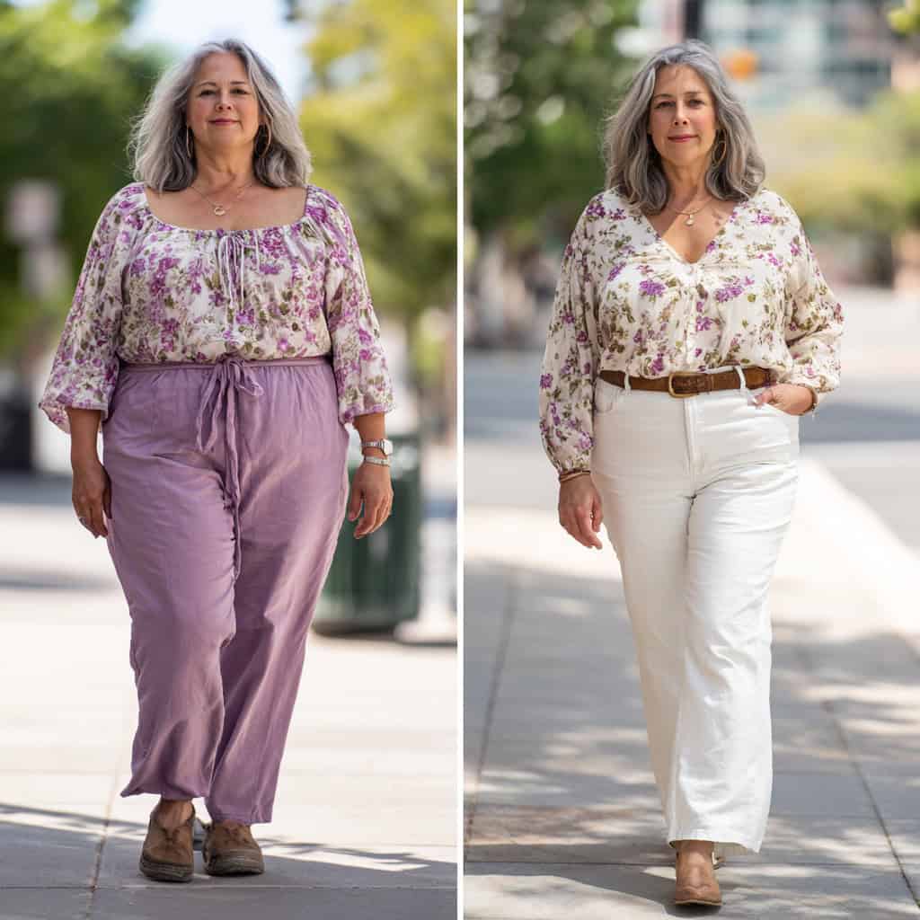 Why it works: Longer pants create height, a lighter floral lifts the face, and the tucked blouse shapes the waist. Updated shoes finish the look with a clean, modern edge.