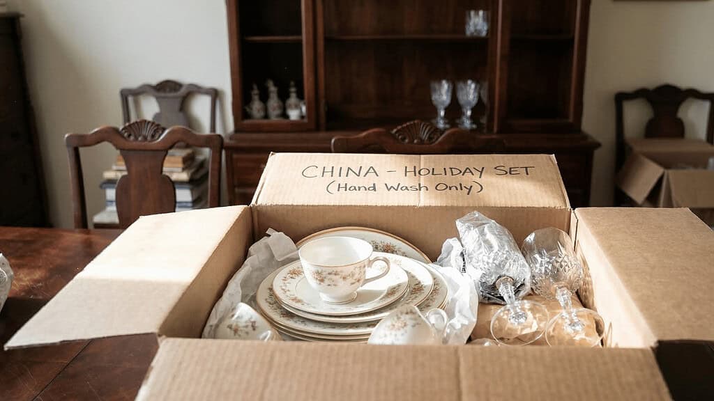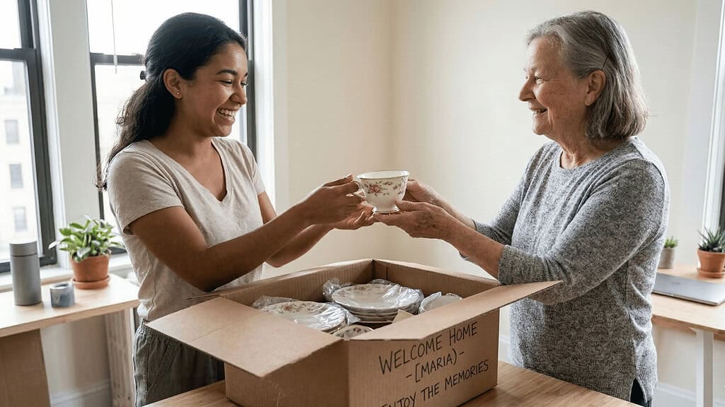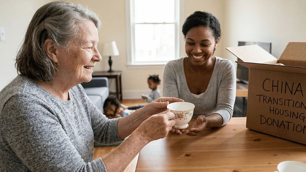 Look into selling it first — estate sale companies, local antique dealers, and Facebook Marketplace are all worth trying. If selling feels like too much effort, look for organizations that furnish transitional housing for families starting over. A full set of dishes going to a family that needs them is a much better ending than a storage box.