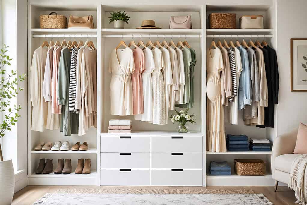 Organizing your maternity wardrobe is all about accessibility. Keep your most frequently worn items within reach and store away the rest to make room for your maternity clothes.