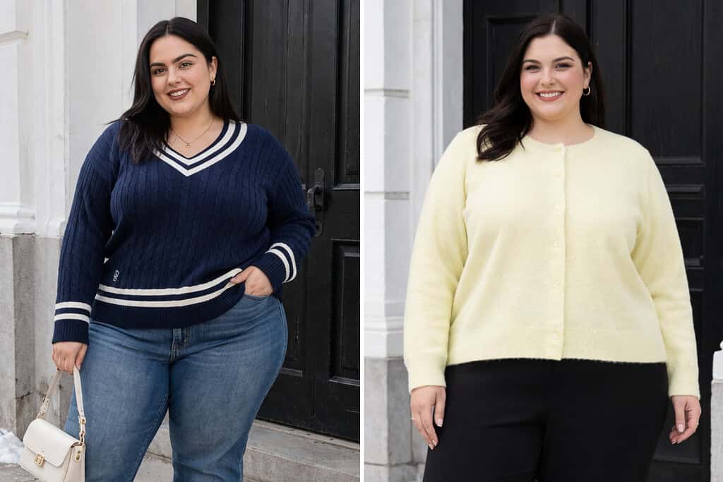 Look for warm, breathable, and comfortable fabrics like wool, cotton, cashmere, fleece, and knit blends. These help retain heat without feeling too heavy. For plus-size comfort, fabrics with a bit of stretch are especially helpful for movement and fit.