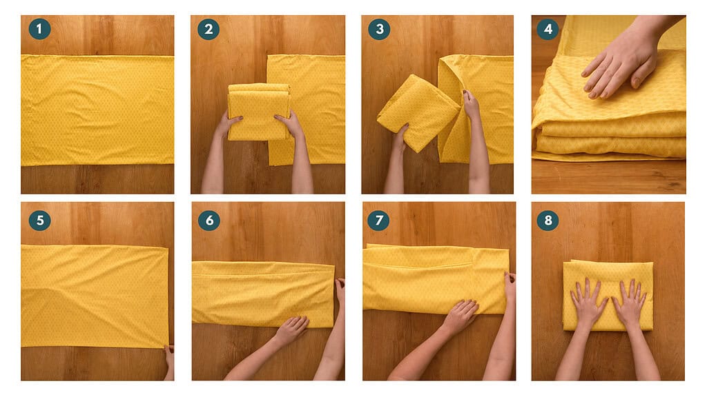 Then take the second pillowcase and slide the entire stack inside it. Fold the open end of the pillowcase over the bundle like an envelope, tucking it underneath so everything stays in place.