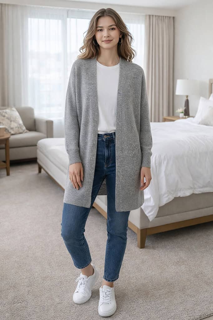 Your lightweight cardigan steps in to keep you comfy and chic. You can throw it over your white tee or wrap it around your shoulders for that effortlessly cool look.