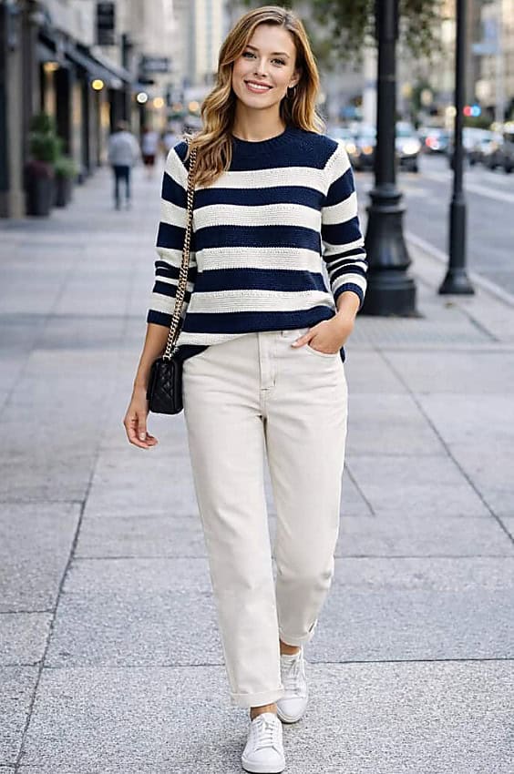 When wearing stripes, remember that vertical orientations are “magical” for looking slimmer, whereas horizontal stripes can be made more flattering by layering a blazer over them to create a “column of color”.