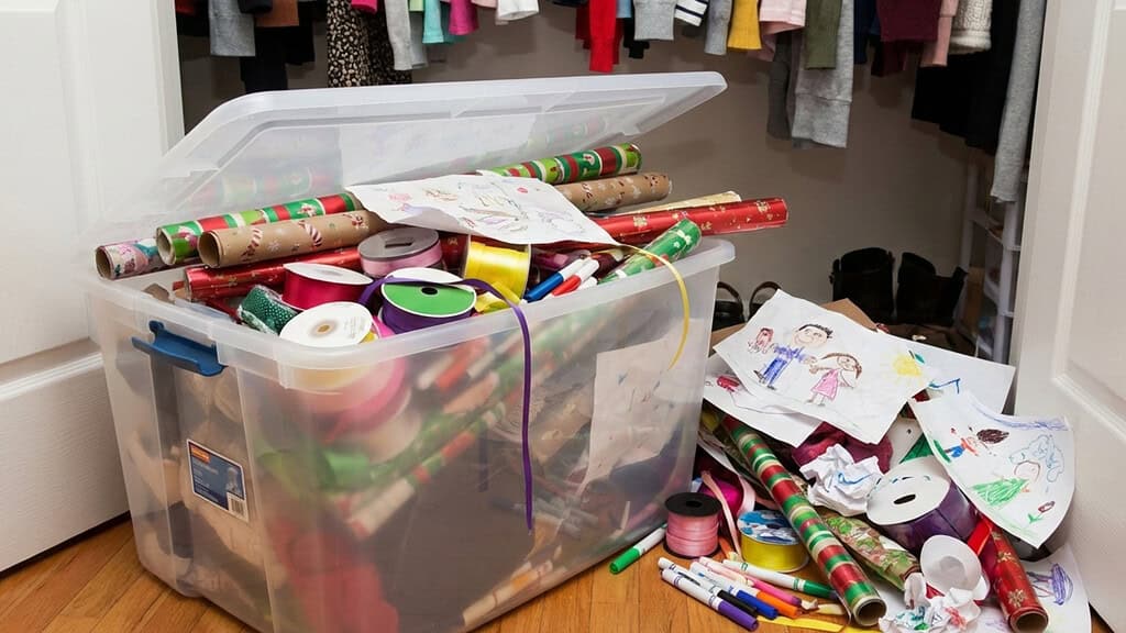 I'd set up a bin for something (gift wrap, craft supplies, the kids' art stuff) and it would look great for the first few weeks. Then little by little, more things would get added. A few extra rolls of ribbon here. Another set of markers there.