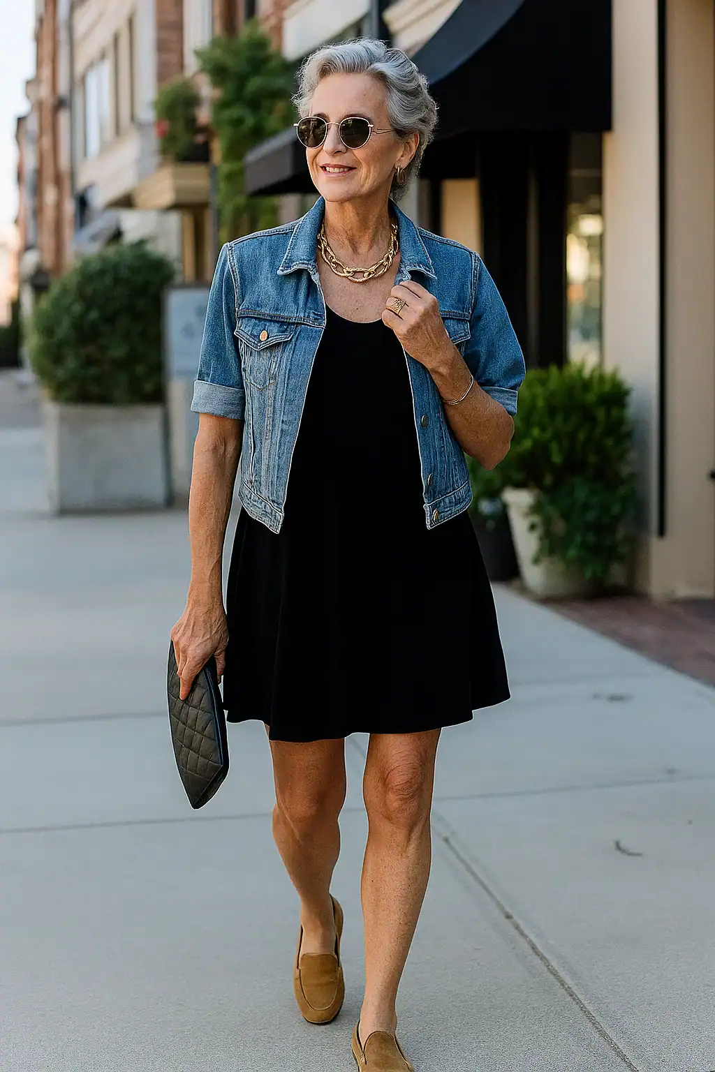 Adding a denim jacket makes the outfit look modern while keeping it relaxed.