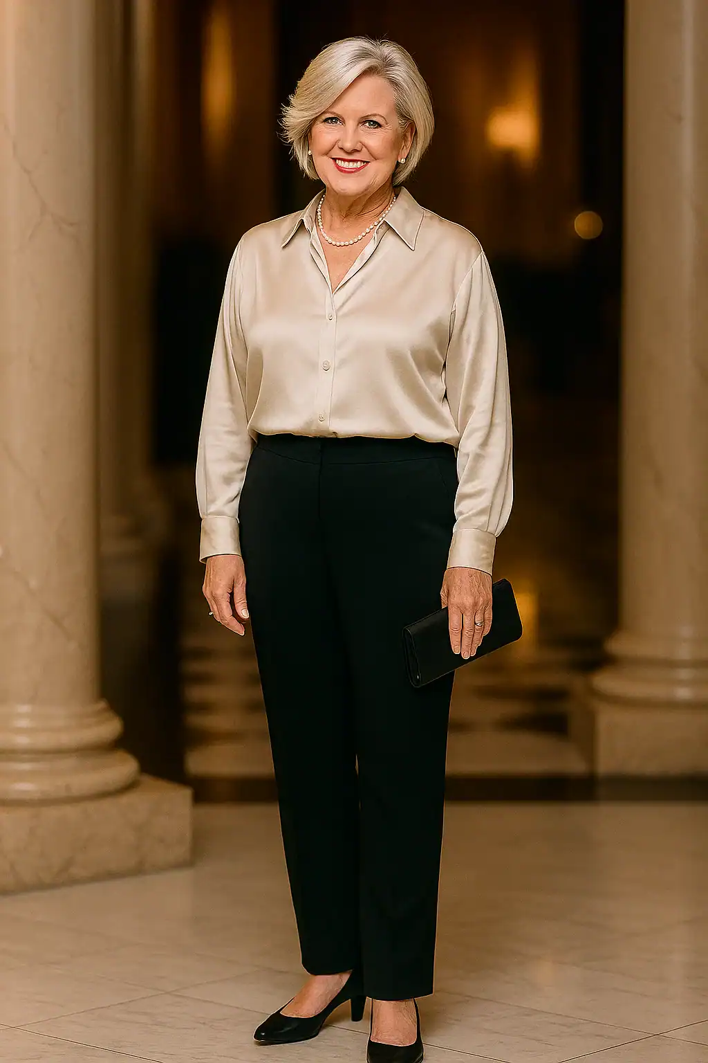 Paired with tailored black pants, it creates a balanced look for dinners or formal gatherings.