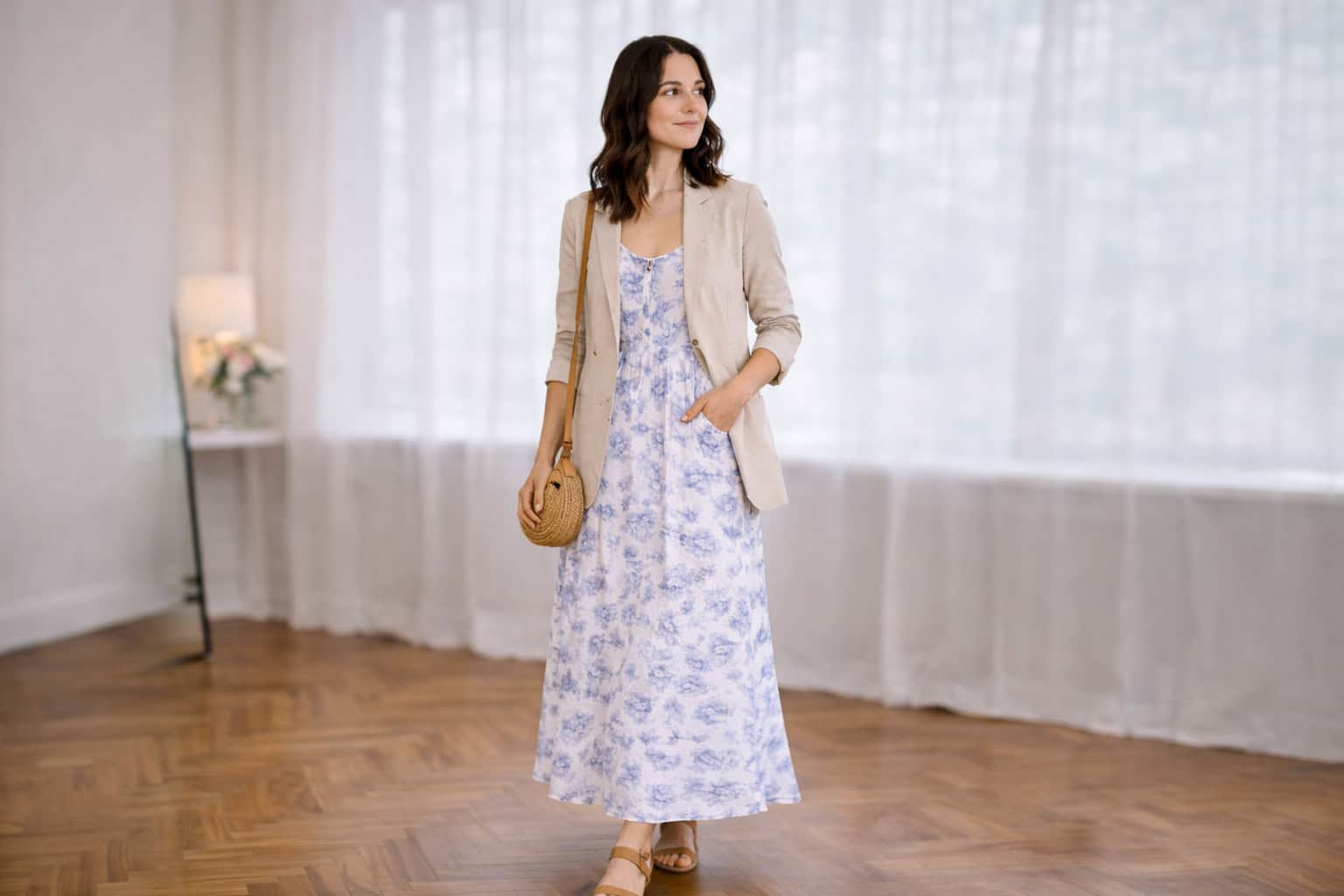Or, you can layer a floral maxi dress with a blazer and sandals for a dressier look.