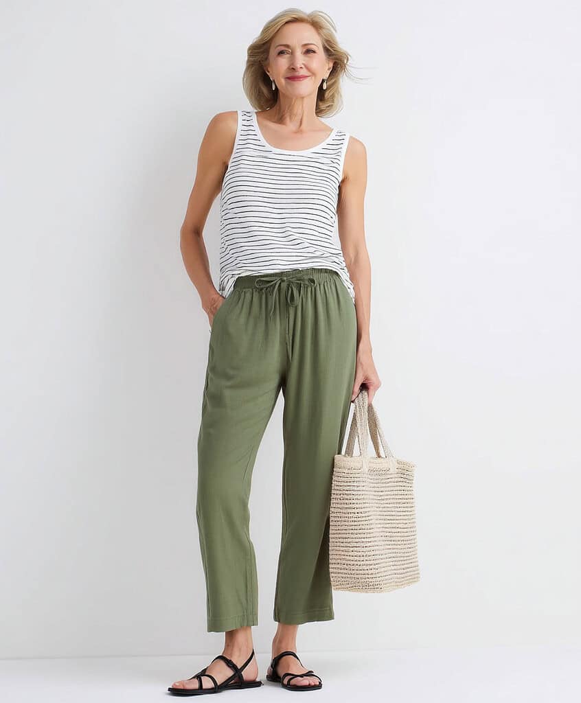 - Wide-Legged Cropped Pants: These pants are a modern and chic option for summer. You can also substitute athleisure pieces with structured 7/8 or capri pants to create a sleeker silhouette while staying cool and comfortable.